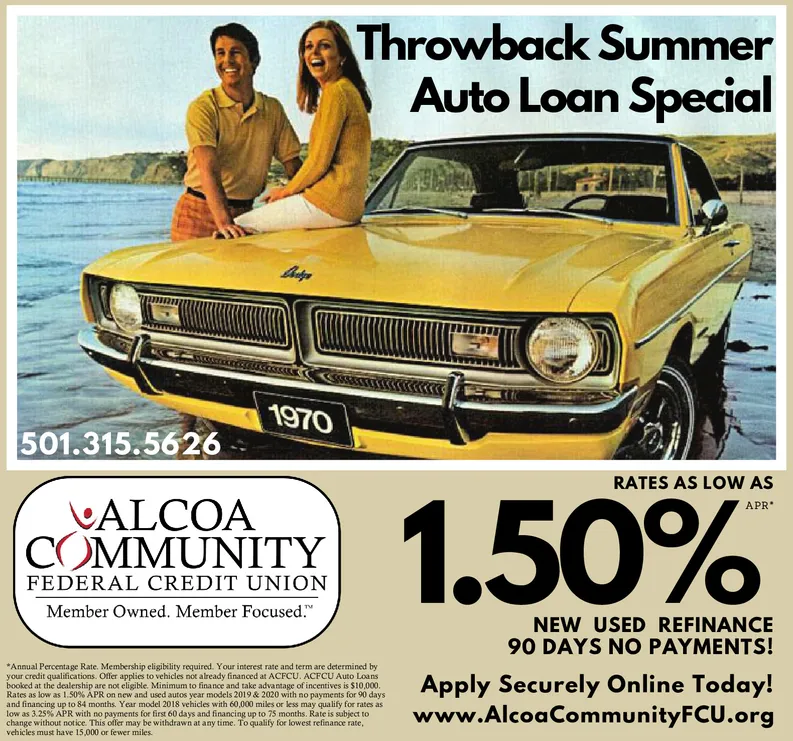 Throwback Summer Auto Loan Special 1970 501.315.5626 RATES AS LOW AS LALCOA COMMUNITY 1.50% APR* FEDERAL CREDIT UNION Member Owned. Member Focused." NEW USED REFINANCE 90 DAYS NO PAYMENTS! *Annual Percentage Rate. Membership eligibility required. Your interest rate and term are determined by your credit qualifications. Offer applies to vehicles not already financed at ACFCU. ACFCU Auto Loans booked at the dealership are not eligible. Minimum to fina nce and take advantage of incentives is S10,000. Rates as low as 1.50% APR on new and used autos year models 2019 & 2020 with no payments for 90 days and financing up to 84 months. Year model 2018 vehicles with 60,000 mikes or less may qualify for rates as low as 3.25% APR with no payments for first 60 days and financing up to 75 months. Rate is subject to change without notice. This offer may be withdrawn at any time. To qualify for lowest refinance rate, vehicles must have 15,000 or fewer miles. Apply Securely Online Today! www.AlcoaCommunityFCU.org Throwback Summer Auto Loan Special 1970 501.315.5626 RATES AS LOW AS LALCOA COMMUNITY 1.50% APR* FEDERAL CREDIT UNION Member Owned. Member Focused." NEW USED REFINANCE 90 DAYS NO PAYMENTS! *Annual Percentage Rate. Membership eligibility required. Your interest rate and term are determined by your credit qualifications. Offer applies to vehicles not already financed at ACFCU. ACFCU Auto Loans booked at the dealership are not eligible. Minimum to fina nce and take advantage of incentives is S10,000. Rates as low as 1.50% APR on new and used autos year models 2019 & 2020 with no payments for 90 days and financing up to 84 months. Year model 2018 vehicles with 60,000 mikes or less may qualify for rates as low as 3.25% APR with no payments for first 60 days and financing up to 75 months. Rate is subject to change without notice. This offer may be withdrawn at any time. To qualify for lowest refinance rate, vehicles must have 15,000 or fewer miles. Apply Securely Online Today! www.AlcoaCommunityFCU.org